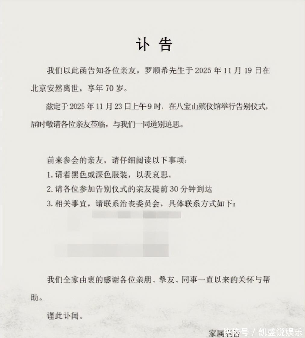 11月20号那天,罗晋的牙东说念主在一又友圈发了一条讣告,上头写得很明晰:罗晋的爸爸罗顺希,11月19号在北京死字了,享年70岁。